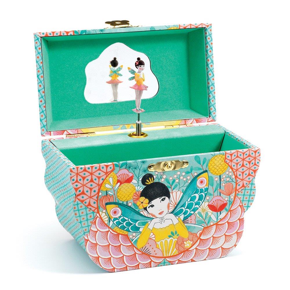 Μουσικό κουτί-μπιζουτιέρα της εταιρίας Djeco. Κουρδίστε το ξύλινο κουτί και μόλις το ανοίξετε η μελωδία του “The time of the cherries” από τον Antoine Renard, θα σας ταξιδέψει στον κόσμο των λουλουδιών παρατηρώντας τη νεράιδα να γυρνάει γύρω-γύρω!